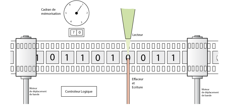 La machine de Turing est un objet conceptuel, une expérience de pensée, une machine de papier, qui est définie comme suit :