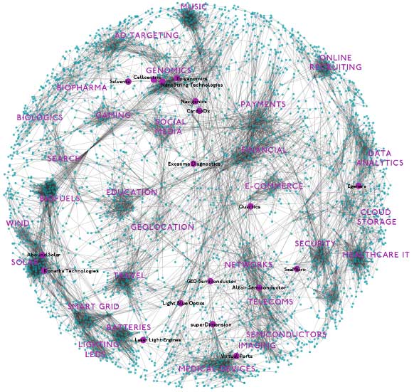 By extracting words and phrases from the collected documents, Quid constructs a "technology genome" that describes the primary focus of each of those 35,000 entities. A map of the connections those genomes can be used by investors to find hints about interesting companies or ideas, says Gourley. Most companies cluster around established sectors, but a few will sit in the white spaces between the clusters and can represent the seeds of new technology sectors.