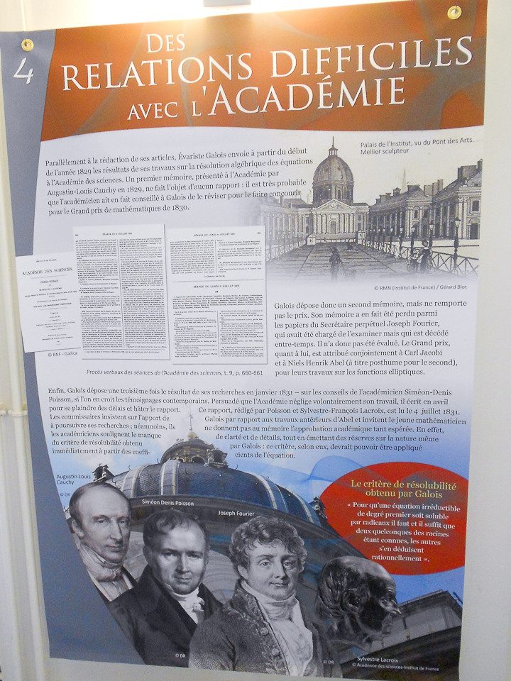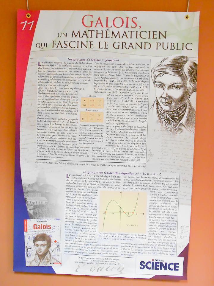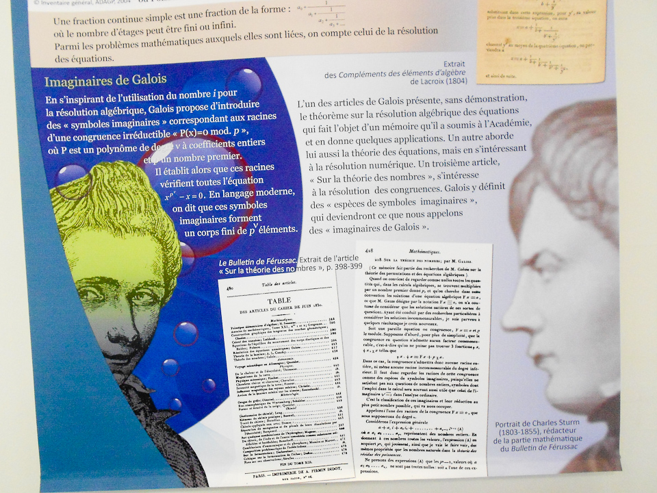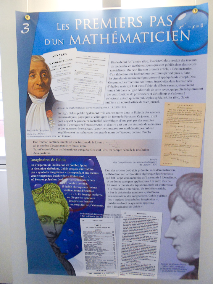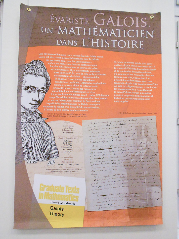 Pour le bicentenaire de la naissance d’Evariste Galois en 2011 la Fondation Sciences Mathématiques de Paris, l’Institut Henri Poincaré et la Société Mathématique de France ont présenté une exposition conçue par C. Ehrhardt et intitulée "Évariste Galois : un mathématicien dans l’histoire".