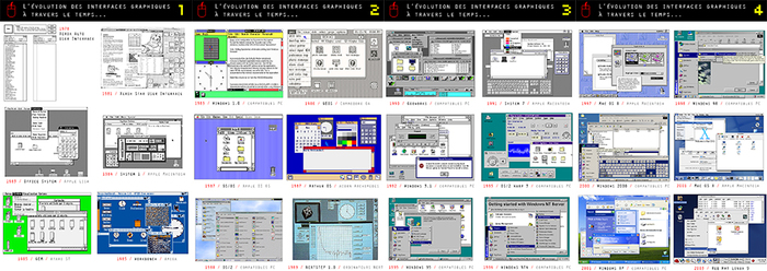 Vous découvrirez également, dans une série de posters, l’évolution des interfaces graphiques homme-machine depuis leur apparition chez Xerox jusqu’à l’interface tactile sur mobile, en passant par l’Atari 520ST, Windows 3.11, Mac OS 9 ...