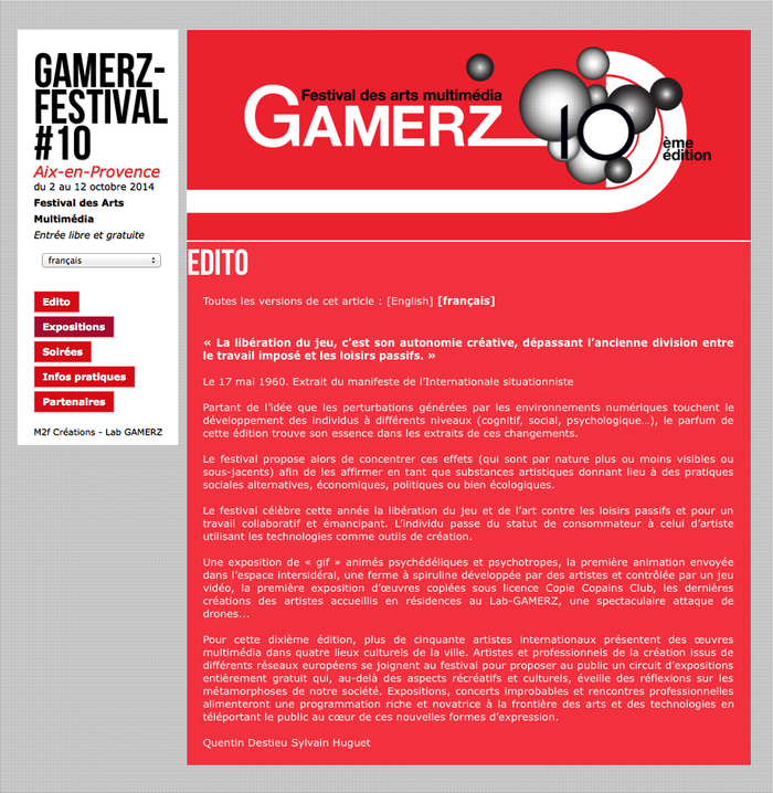 Une exposition de « gif » animés psychédéliques et psychotropes, la première animation envoyée dans l’espace intersidéral, une ferme à spiruline développée par des artistes et contrôlée par un jeu vidéo, la première exposition d’œuvres copiées sous licence Copie Copains Club, les dernières créations des artistes accueillis en résidences au Lab-GAMERZ, une spectaculaire attaque de drones...