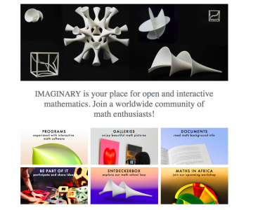 La plateforme IMAGINARY, lancée en 2013, est soutenue par des instituts allemands, le célèbre Mathematisches Forschungsinstitut Oberwolfach et la Fondation Klaus Tschira. Une de ses principales missions est d’appuyer très concrètement l’organisation d’expositions visuelles, ludiques et interactives autour des mathématiques en mettant à disposition des images, des vidéos, des programmes interactifs, etc. Un aspect fondamental de cette plateforme est l’aspect collaboratif : quiconque peut proposer de nouveaux contenus, de nouveaux programmes interactifs, de nouveaux objets (puzzles, sculptures, expériences de physique, …), en jouant le jeu du code source ouvert (open source) et de la mise à disposition des plans de fabrication des objets, textes,… pour qu’ils soient reproduits tout en respectant les droits d’auteur.