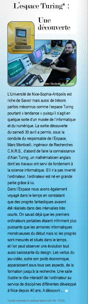 L’Université de Nice-Sophia-Antipolis est riche de Savoir mais aussi de trésors parfois méconnus comme l’espace Turing pourtant « tendance » puisqu’il s’agit en quelque sorte d’un musée de l’informatique et du numérique. La sortie découverte du samedi 30 avril a permis, sous la conduite du responsable de l’Espace, Marc Monticelli, ingénieur de Recherches C.N.R.S., d’abord de faire la connaissance d’Alan Turing, un mathématicien anglais dont les travaux ont servi de fondement à la science informatique. S’il n’a pas inventé l’ordinateur, l’ordinateur est né en grande partie grâce à lui.