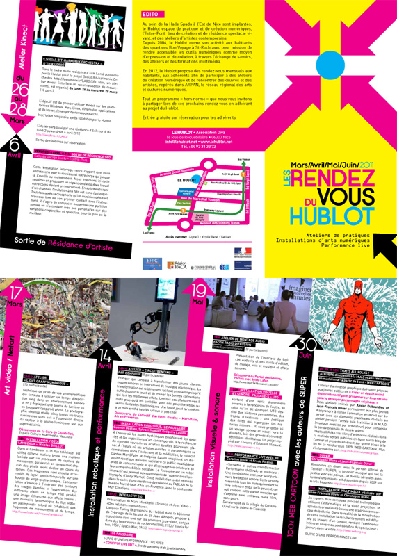 En 2012, le Hublot propose des rendez-vous mensuels aux habitants, aux adhérents afin de participer à des ateliers de création numérique et de rencontrer des œuvres et des artistes, repérés dans ARPAN, le réseau régional des arts et cultures numériques.