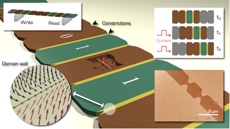 Illustration : Principe du race track memory : chaque bit d’information (0 ou 1) correspond à une orientation de l’aimantation (vers le haut ou vers le bas). L’application d’une impulsion de courant (insert haut à droite) permet de bouger tous les bits magnétiques en bloc de la tête d’écriture vers la tête de lecture. La réalisation de sites de piégeage artificiels tels que des constrictions (insert bas à droite) permet de contrôler le stockage à long terme des parois magnétiques.