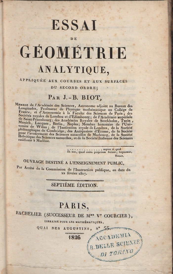 C’est vers l’enseignement que Biot oriente sa carrière après ses études d’ingénieur. Il devient professeur de mathématiques à l’École centrale du département de l’Oise à Beauvais en mars 1797, poste qu’il occupe durant 4 ans, et publie le contenu de ses leçons destinées aux candidats à l’École polytechnique en 1802 (Essai de géométrie analytique : appliquée aux courbes et aux surfaces du second ordre). Grâce à l’appui de Laplace, il est nommé en novembre 1800, âgé de 26 ans, professeur de physique mathématique au Collège de France, succédant à Jacques Antoine Joseph Cousin, démissionnaire1. Il enseigne à l’Athénée de Paris de 1803 à 1806. Nommé premier titulaire de la chaire d’astronomie de la faculté des sciences de Paris le 18 avril 1809, il devient docteur ès sciences par collation le 5 août de la même année. Il est entre 1816 et 1826 chargé de la moitié du cours de physique pour l’acoustique, le magnétisme et l’optique, Gay-Lussac, titulaire de la chaire de physique, enseignant la chaleur, les gaz, l’hygrométrie, l’électricité et le galvanisme. Il est rappelé aux fonctions de professeur d’astronomie en mars 1826 et c’est Claude Pouillet qui reprend ses enseignements pour le cours de physique. Il est doyen de la Faculté des sciences de Paris à partir de 1840, succédant à Louis Jacques Thénard. Il est mis à la retraite comme professeur de la faculté des sciences en 1849 et y est nommé professeur honoraire.