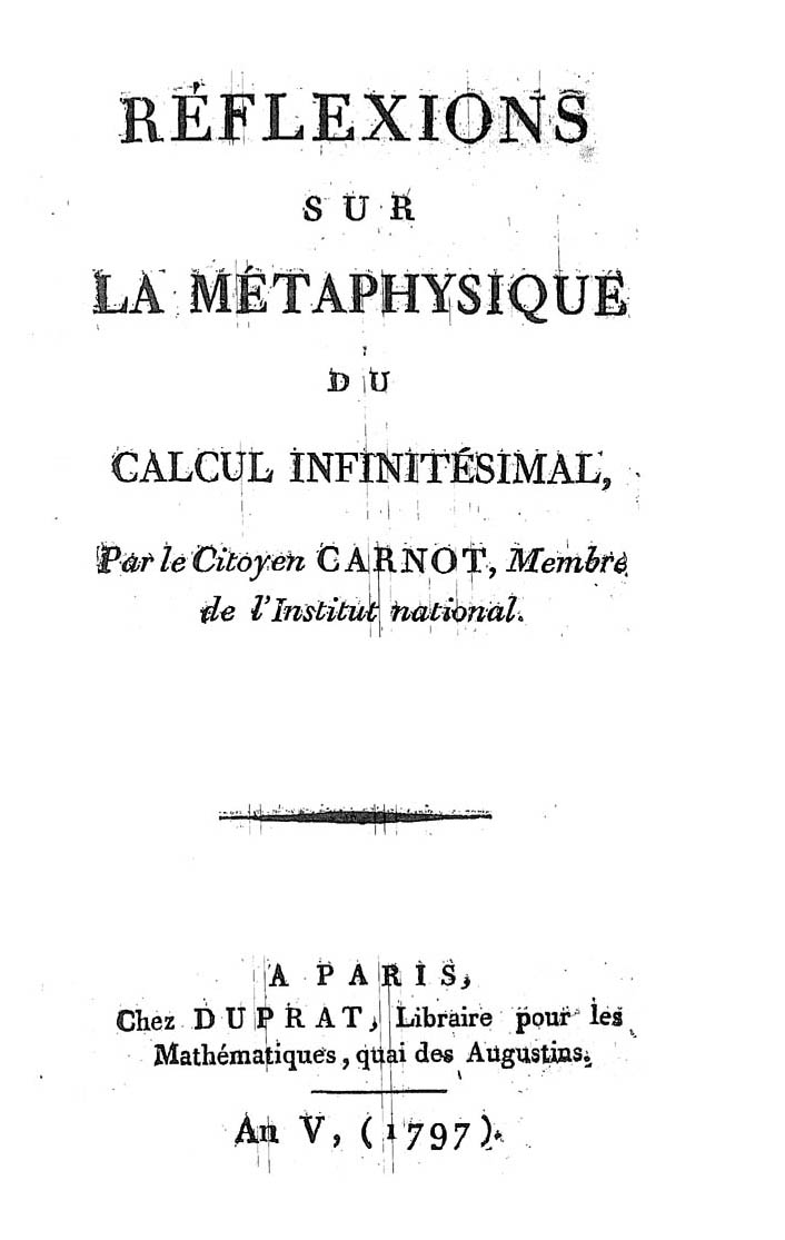Lazare Carnot est mondialement connu pour ses travaux scientifiques. Dans son Essai sur les machines en général (1783) (édition de 1786) , il précisa les lois du choc et énonça la loi de conservation du travail. Il publie Métaphysique du calcul infinitésimal en 1797 (3e édition, 1839). Avec sa Géométrie de position (1803) (lire en ligne), suivie en 1806 de son Essai sur la théorie des transversales, il apparaît en même temps que Monge comme l’un des créateurs de la géométrie moderne. Il participa par ailleurs avec celui-ci à la fondation de l’École polytechnique.