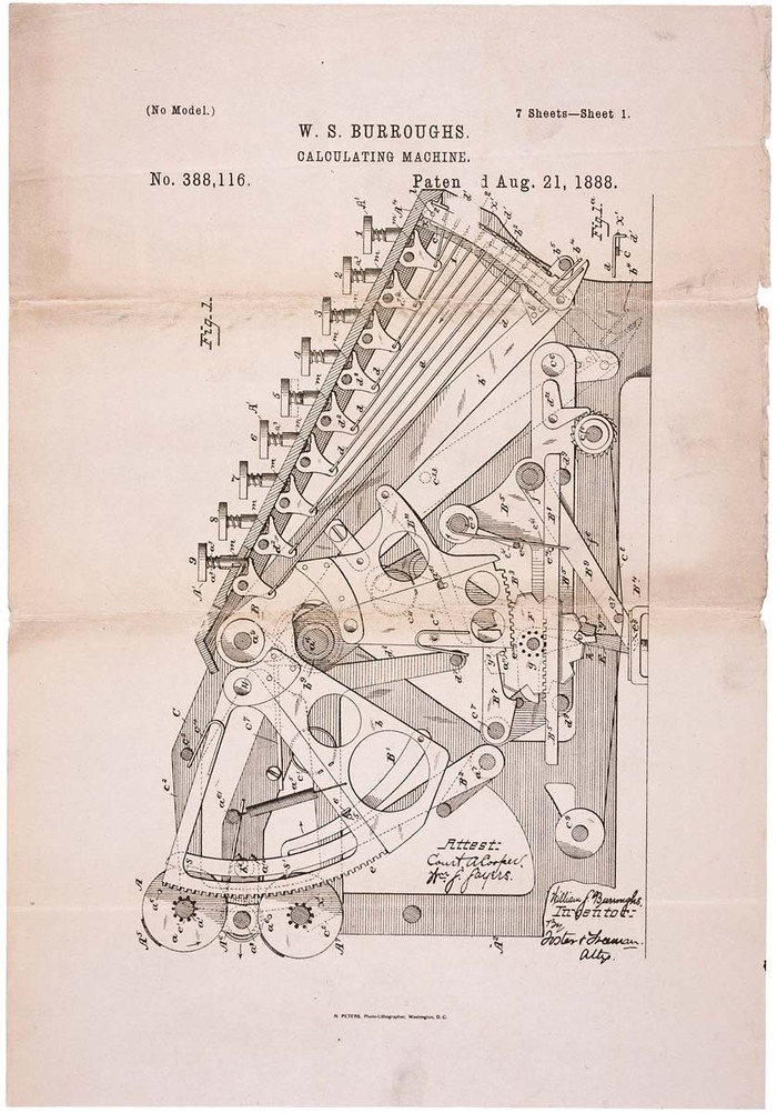 William Seward Burroughs, employé de banque, est l’inventeur d’une "additionneuse" permettant d’imprimer les étapes et les résultats des calculs.Sur la première version, le seul moyen de voir le résultat était de l’imprimer.