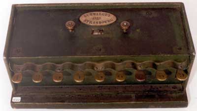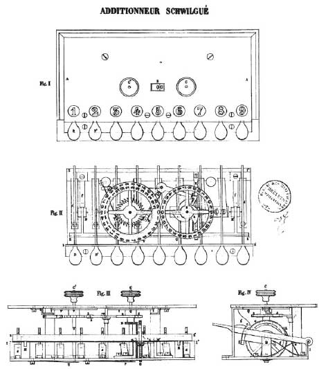 Jean-Baptiste Schwilgué, architecte horloger de la troisième horloge astronomique de la cathédrale de Strasbourg, est le premier à proposer une additionneuse à touches.