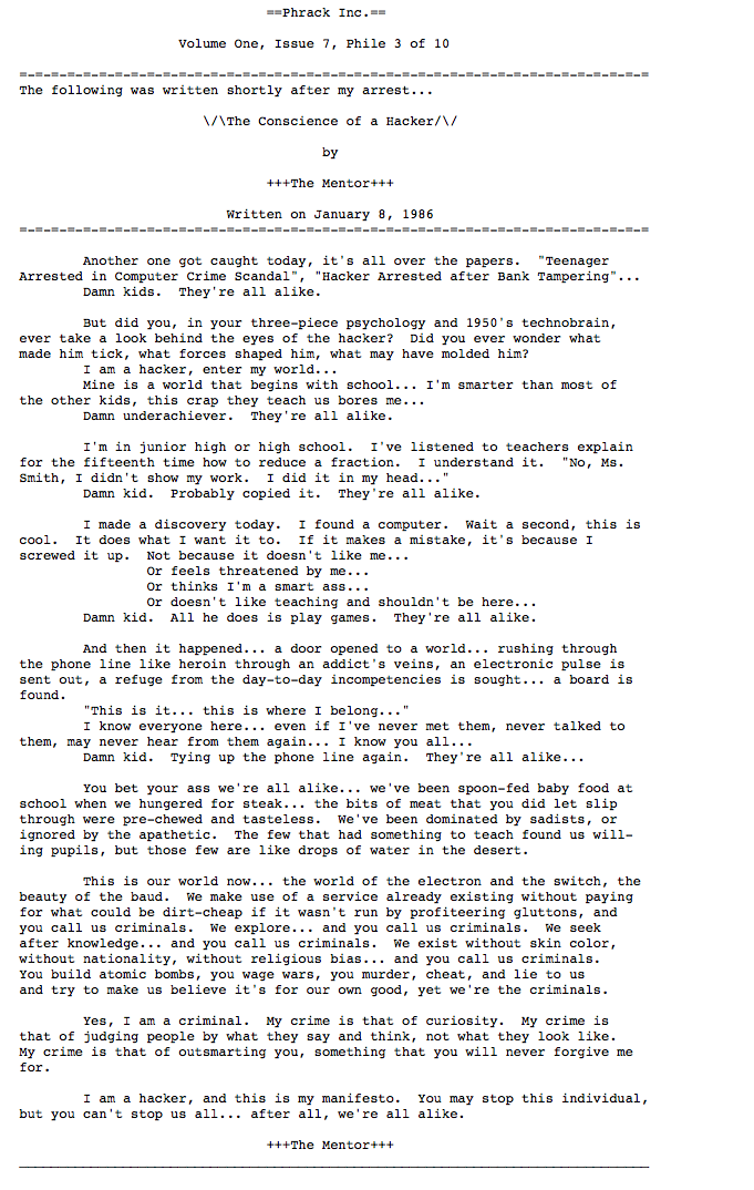 Publié pour la première fois dans le magazine électronique underground Phrack (Volume 1, Numéro 7, Phile 3 de 10), on peut de nos jours le trouver sur de nombreux sites web. Il est souvent confondu, du fait d’une proximité de titre, avec l’essai de 2006 sur la libération de l’information Un Manifeste Hacker (“A Hacker Manifesto”) du théoricien des médias McKenzie Wark.