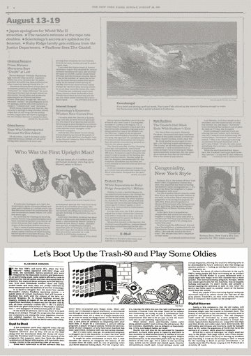Maybe this will also be the salvation for forsaken software. As hard disks grow in capacity and there is less incentive to shed excess bytes, a residue of virtual antiques might accumulate in long-forgotten folders and directories, to be unearthed years later by the junk dealers of the new age. All it takes is one surviving copy, which can be cloned and cloned again. Internet entrepreneurs could open virtual antique stores and virtual museums, offering the mustiest old programs to be downloaded by future collectors. But that brings up another problem — finding an old digital clunker to run the programs on.