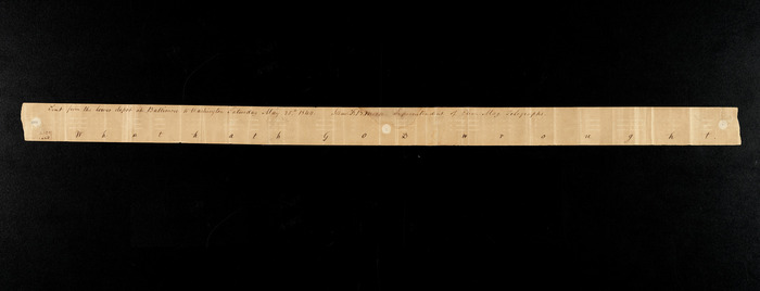En 1843, le Congrès a alloué 30 000 $ à Morse pour construire une ligne télégraphique électrique entre Washington et Baltimore. Morse et son partenaire, Alfred Vail, ont achevé la ligne de 40 milles en mai 1844. Pour les premières transmissions, ils ont utilisé une citation de la Bible : "Qu’est-ce que Dieu a fait". Morse a envoyé le message depuis le Capitol à Vail à Baltimore. Cette bande papier est le message de retour de Vail confirmant ce qui a été reçu.
