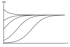 Il n’est pas difficile de se convaincre que les solutions sont de la forme montrée sur la figure. Si la population initiale est plus petite que la capacité de charge (qui vaut ici 1), elle commence par croître exponentiellement avant de subir un infléchissement et de tendre vers 1.
