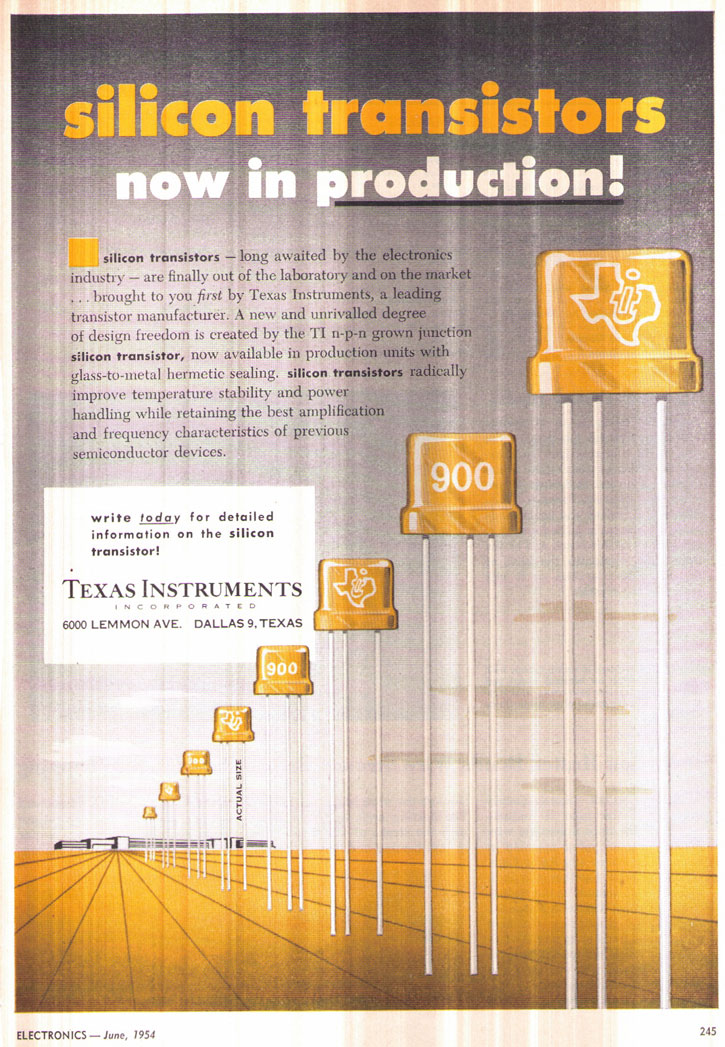 Le 10 mai 1954, Texas Instrument annonce un nouveau transistor à base de silicium, mis au point par Gordon Teal, permettant de faire baisser le prix de ce composant à 2,50$.