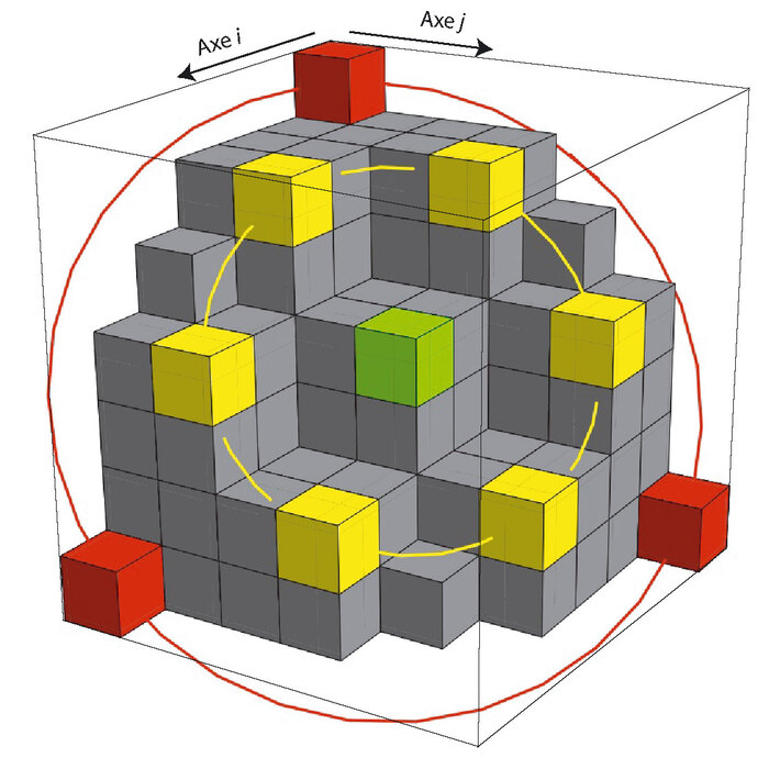 La conjecture d’Andrews et Robbins démontrée par M. Kauers et ses collègues porte sur les « partitions planes totalement symétriques ». Il s’agit des empilements, au sens défini plus haut, dont la forme reste inchangée lorsqu’on permute les axes de coordonnées i, j et k (voir la figure). Dans ce cas, chaque groupe de cubes qui s’échangent entre eux forme une « orbite ». La conjecture devenue théorème affirme qu’en développant en somme de puissances entières de q le produit (sur toutes les valeurs de i, j, k jusqu’à N) des termes
